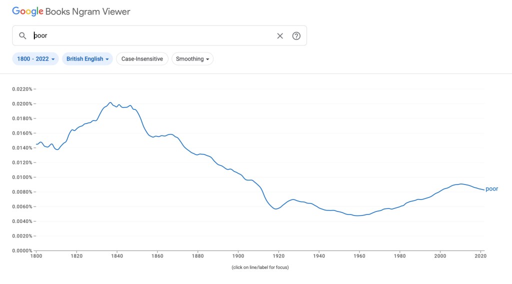 One example of this obfuscation is the way the poor have become the disadvantaged, as if a decent life were a form of privilege. The chart below shows Google’s calculation of the frequency of use of the word ‘poor’ since 1800: